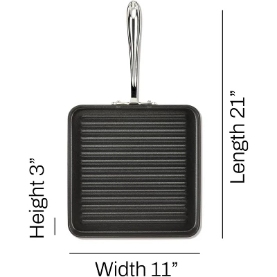 The HA1 Hard Anodized Nonstick 11 inch Square Grill features an open surface with low walls for easy flipping and raised ridges for capturing beautiful searing marks and releasing fat.