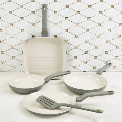 - CONSTRUCTION: Frying Pan 7.75 inches and 9.5 inches, grill pan 9.75 inches, pancake pan 10 inches, and slotted nylon turner 13.75 inches, Moonmist. Pans are made from recycled Aluminum with CeraGreen non-stick ceramic coating. Comes with stay-cool handle for a safe and comfortable grip while the hanging loop that allows for easy storage and minimal kitchen space. The turner is made from high-quality, heat-resistant recycled nylon which is suitable for all non-stick cookware