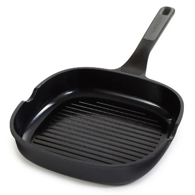 - Nonstick Cast Aluminum 10.25″ Grill Pan with a stay-cool handle for a comfortable, secure grip and features a non-stick CeraGreen coating for easy food release.