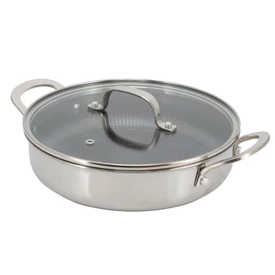 Upgrade your cookware collection with the Better Chef 11-Inch 3-Ply Stainless Steel Nonstick Deep Fry Pan with Lid in sleek silver. Designed for versatility and durability, this pan features a PFOA-free nonstick coating that ensures effortless food release while being safe for use with smooth-edged metal utensils. The triple-layer stainless steel construction provides even heat distribution, making it perfect for searing, sautéing, and frying. Its double-riveted handle offers a secure and comfortable grip, while the included tempered glass lid helps lock in moisture and flavor.