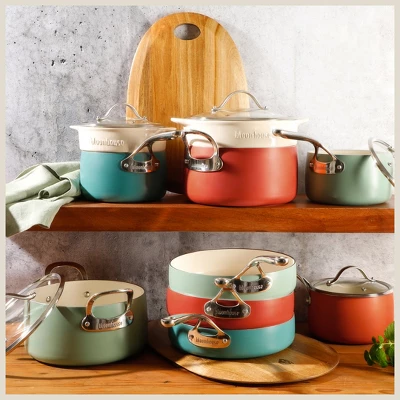 A health-driven, eco-conscious and artisan-inspired suite of pots and pans, the bloomhouse™ 12-piece Enameled Aluminum Cookware Set with Ceramic Steamer Inserts lends a sense of abundance and beauty to any kitchen with full, round-shaped cookware – drawing inspiration from the striking curvature of Colombian sculptures. Crafted from high-quality, heavy-gauge aluminum, this kitchenware set efficiently distributes heat to serve up delicious culinary perfection without cool spots and uneven results. The ceramic nonstick interior is made without PTFE, PFOA, PFAS, lead or cadmium to ensure safer and health-conscious cooking. Designed with Supreme Fusion Technology for long-lasting durability and everyday use, this non-toxic ceramic nonstick cookware is 10x stronger than the standard coating typically found in ceramic nonstick cookware pots and pans. The extended cast handles provide a safe and comfortable grip when lifting, transferring and serving. For healthier cooking styles, use the Cook-to-Serve ceramic steamer insert to prepare your favorite flavors in a manner you feel good about. Our beautifully-crafted cookware will help you prepare meals for sharing and celebrating, while encouraging mindful lifestyle choices that nourish people and the planet. The aluminum cookware is hand wash recommended and oven safe up to 500°F (400°F with glass lids) and the ceramic steamer inserts are dishwasher and oven safe up to 350°F. It comes with 12 protective care bags to store the pieces safely when not in use and to preserve the quality for generations to come.bloomhouse™ is a collection of modern-day kitchen and dining pieces that empower spirits, honor our Earth and celebrate its people. Driven by a responsible, nature-positive ethos, bloomhouse™ aspires to share a lifestyle that’s good for you and good for the planet. With a mission rooted in purpose, bloomhouse™ will plant a tree on your behalf with every set sold in partnership with the non-profit organization One Tree Planted.