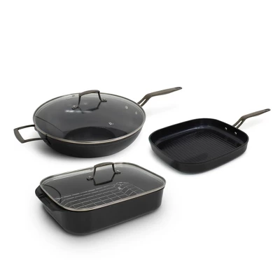 Made from 100% recycled hard-anodized, forged aluminum, the Blu.Cookware is designed for durablilty, without being heavy – for professional and home chefs alike. All Blu. Cookware is coated with a revolutionary non-stick ceramic coating that we call Blu. Leaf Non-Stick. It is 100% PFAS free (including free from PFOS, PFAS and PTFE) resulting in a non-toxic, chemical-free cooking experience. Put simply, it’s a game-changer in the kitchen for more reasons than one. While the revolutionary non-stick surface makes cleaning easier than ever before, each pan comes with a bamboo cleaning brush to lift any thicker layers of fats and sauces. Blu. cookware is suitable for all cooktops, including induction, and is dishwasher safe.The Kitchen Sidekick Set contains all your specialty pans that allow you to elevate your cooking. From Sunday roasts, holiday meals, weekday stirfrys, braised meats and more – the Blu. Cookware sidekick set has all the tools you need. Blu. – the conscious cookware for the conscious cook.