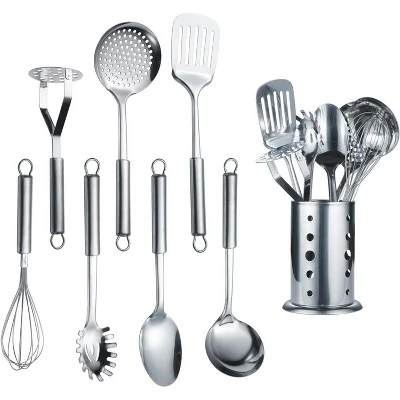 BRINJOY presents an elegant 8-piece stainless steel cookware set featuring a mirror-polished finish that combines professional functionality with dazzling visual appeal. This comprehensive collection includes eight essential tools: a ladle for effortless serving, a skimmer for precise draining, a colander for efficient straining, a pasta spatula for easy handling, a tablespoon for versatile use, a potato masher for perfect textures, a whisk for smooth blending, and a sleek stand for organized storage. Crafted from premium rust-resistant stainless steel, each utensil boasts a perfectly balanced handle for comfortable grip and optimal control during cooking. The set’s brilliant mirror finish adds a touch of sophistication to any kitchen, while the dishwasher-safe construction ensures effortless maintenance. Designed for both everyday meals and special occasions, this set elevates cooking into an aesthetic experience.