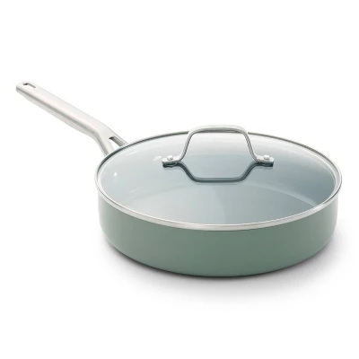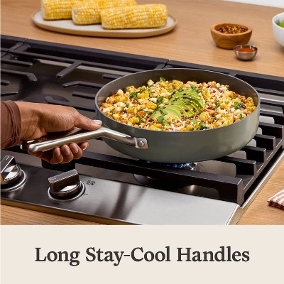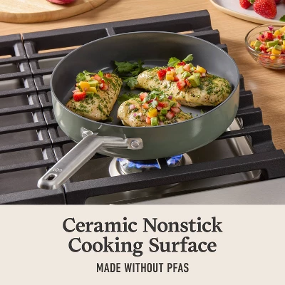 Its durable ceramic nonstick coating lets you cook without added oil or butter, for a healthier way to make your favorite foods, and is made without PFAS. Interiors are scratch resistant and metal-utensil safe. Stainless steel handles stay cool on the stovetop; while cooking pan and tempered glass lid are oven safe up to 450 degrees F for stovetop-to-oven versatility. Sturdy ceramic-coated aluminum construction provides fast, even heating for consistent cooking results.