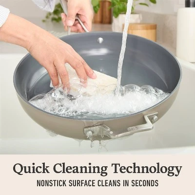 Hard-anodized ceramic-coated aluminum construction delivers fast, even heating while eliminating hotspots for precision searing, sautéing, and browning—ensuring exceptional results every time. Constructed with a PFA-free, scratch resistant and metal utensil-safe ceramic nonstick surface, cooking becomes a pleasure. And with Quick Clean Technology, cleanup’s a breeze. Long stainless steel handles stay cool on the stovetop, while pans and tempered glass lids are oven safe up to 500 degrees F for stovetop-to-oven versatility.