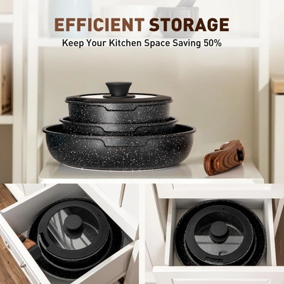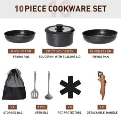 - Complete 10 Piece Set: Include 8-inch frying pan / 10-inch frying pan / 2 qt saucepan with silicone lid / detachable handle / 2 pcs utensils / 2 pot protectors / storage bag