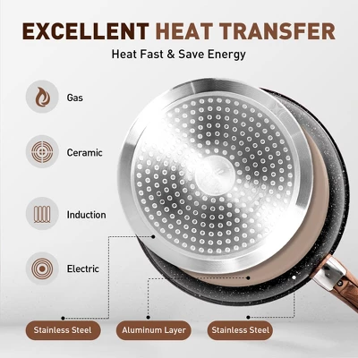 - Fast & Even Heating: With its aluminum core, this cookware heats quickly and distributes heat uniformly, eliminating hot spots for perfectly cooked dishes every time.