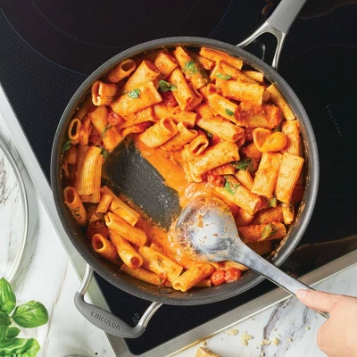 EXTREME NONSTICK THAT WON’T SCRATCH. EVER. From the inventors of hard-anodized nonstick cookware comes the Circulon A1 Series with ScratchDefense™ Technology. Open up a new dimension in scratch resistance and unbeatable nonstick performance and longevity with ground-breaking ScratchDefense™ nonstick technology crafted with durable aerospace-grade materials to create a thicker and harder surface than ordinary nonstick and eliminate scratching, sticking, and flaking with our most advanced nonstick yet. Cook with complete confidence using this dishwasher safe sauté pan with a triple-layer nonstick cooking surface that lasts 130X longer than the competition and stands up to laboratory tests simulating 200+ years of daily wear and tear. This performance-primed and feature-forward sauté pan features a tempered glass lid to lock in heat and drive flavor, and is dishwasher safe and oven safe to 400 degrees F. Even better, this versatile kitchen pan is built with an aluminum core for fast, all-over heat delivery and a thick, induction-suitable stainless steel base to boost durability and heat retention. Pioneering technology. Extreme durability. Flawless performance. The Circulon A1 Series with ScratchDefense™ Technology is complete toughness, re-engineered for total cooking confidence.