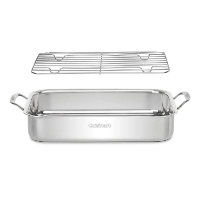 The newest addition to the Cuisinart® Chef’s Classic™ line is an elegant mirror-polished stainless steel lasagna pan with roasting rack. Just the right size for favorite multi-layered lasagnas, it has riveted comfort-grip stainless side handles that make placing lasagnas into the oven and lifting them out, safe and easy. The stainless steel interior does not react with food, so flavors stay true and tasty, and the brilliant stainless exterior makes this pan a perfect serving piece for dinner or buffet tables.
