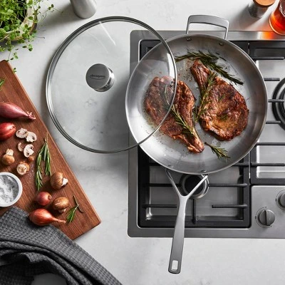 Inspired by chefs and designed for home kitchens, these professional, stainless-steel fry pans are the secret to crispy chicken cutlets, caramelized steaks, and delicious stir-fries. The 8- and 11-inch fry pans are ideal for fried eggs while the 12.5-inch fry pan has a perfect-fit lid for tender breakfast potatoes. It’s convenient helper handle makes for easy maneuvering.The durable 5-ply construction boasts optimal heat distribution, conduction, and retention. This guarantees even cooking from rim to rim, for perfect pancakes, browned meats, and seared salmon. Don’t worry about cooking at high temperatures – the signature flat base stability prevents warping.Enjoy chef-friendly features like stay-cool, 18/10 stainless-steel handles. Their secure rivets will have you flipping omelettes with confidence. While the perfect pouring edge ensures no-mess cooking and serving.