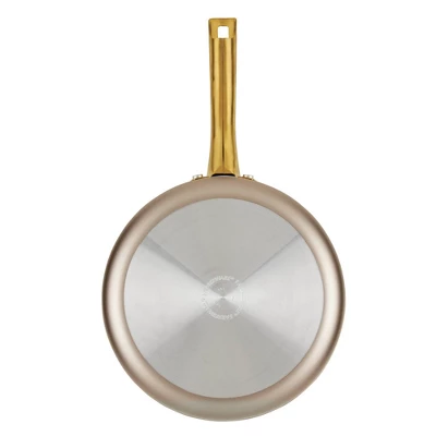 - RADIANT STYLE: With a contemporary champagne-colored surface, color-matched lid, and sleek gold-colored stainless steel handle that is the ultimate on-trend accent, this saute pan makes a statement in any kitchen