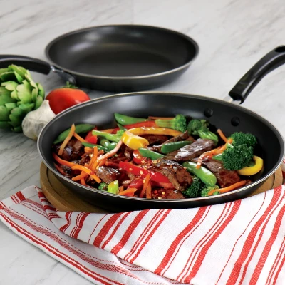 The Gibson Everyday Highberry 2 piece frying pan cookware set comes with a 12in and 10in frying pan. Each pan features a nonstick coating for easy food release, low fat cooking options, and fast clean up. Cool touch handles let you move pans from burner to burner safely while cooking. Lightweight construction with ergonomic handle grip.