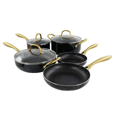 Have all your kitchen essentials ready with this Gibson Home Ellsworth 12 Piece Aluminum Nonstick Cookware Set. The set includes one dutch oven with lid, one saute pan with lid, one saucepan with lid, one 9.5″ frying pan, one 8″ frying pan, and four felt pan protectors. This set has everything you need to start cooking in your kitchen making it perfect for new home owners or even those looking to upgrade their cookware. The included felt protectors helps keep your cookware in prime condition by preventing scratching when the pans are stored away. Nonstick interior and ergonomic handles and knobs makes these super easy and convenient to use. Tempered glass lids allows you to safely watch your food while it’s cooking. All pans are dishwasher safe, but it’s highly recommended to hand wash as extensive use of detergents may cause surfaces to dull.
