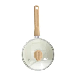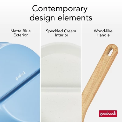- Contemporary Design Elements: Features a wood-look handle, elegant matte blue exterior and speckled cream interior.