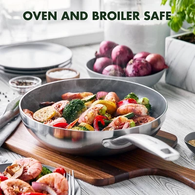 Designed for daily life, this stainless steel wok is your next standby for stir-frying, roasting, steaming—this pan does it all. And don’t worry about cleanup. The metal utensil safe pan features a diamond-enhanced ceramic nonstick coating that delivers ultra-fast performance and effortless nonstick release.