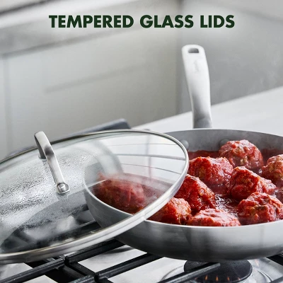 - ● Get a good look at your meal in progress with this set’s tough glass lids, oven safe up to 425˚F