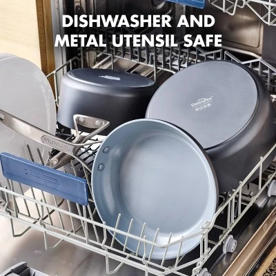 This collection’s healthy ceramic nonstick coating is designed to stand up to daily demands—so it’s dishwasher, oven, and even metal utensil safe. Hard anodized aluminum bodies promote even heating while adding strength and scratch resistance. Sleek stainless steel lids are ultra-durable and oven safe. The polished stainless steel handles are ergonomic and riveted for a strong hold.”