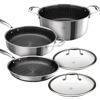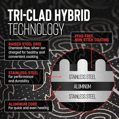 - TRI-CLAD STAINLESS for Quick & Even Heating: Hellâs Kitchen Hybrid Tri-Clad cookware features stainless steel construction with a conductive aluminum core, and a laser-etched flame pattern above a durable nonstick surface.