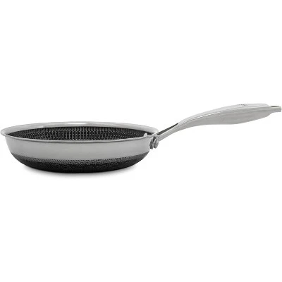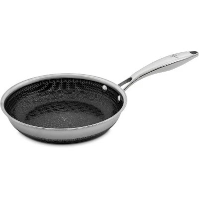 - TRI-CLAD STAINLESS for Quick & Even Heating: Hell’s Kitchen Hybrid Tri-Clad cookware features stainless steel construction with a conductive aluminum core, and a laser-etched flame pattern above a durable nonstick surface.