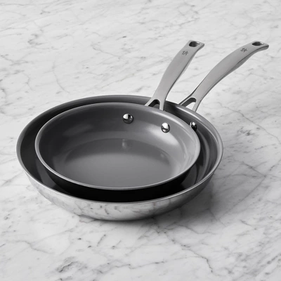 HENCKELS Clad H3 ceramic nonstick cookware offers easy release combined with durability, technological innovation, and exquisite style. Fry eggs and make a gooey grilled cheese in the 8-inch fry pan or sear meat and sauté vegetables in the just-the-right-size 10-inch fry pan. Available in a variety of set configurations from the 2-piece fry pan sets to the 10-piece cookware set, there’s an assortment for every kitchen.The heavy-duty, tri-ply clad construction with an aluminum core heats up evenly and quickly. The Ceraforce ceramic nonstick coating offers quick and easy release. Clad H3 boasts superior scratch-resistance and is safe to use with metal utensils.The tempered glass lids lock in moisture and let you monitor the cooking process while the flared pouring rim offers seamless, mess-free pouring. Thanks to the stay-cool, hollow cast handles with hanging loop, you can easily store your cookware. Clad H3 is compatible with all stovetops, including induction, and is oven safe to 400°F. Dishwasher safe, HENCKELS Clad H3 is also simple to clean, making this easy-to-use cookware a pleasure to cook with.