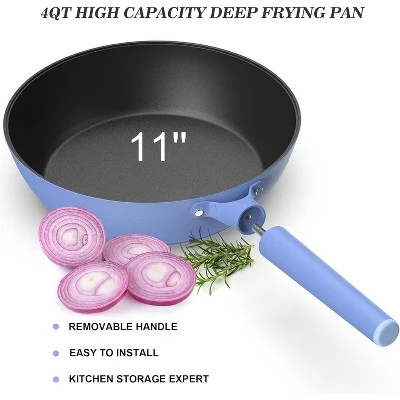 Healthy Nonstick frying Pans: Double-layer water-based non-stick coating, the healthy interior pan is free of PFOA, PFOS, or other harmful materials. Little or no oil is enough for this nonstick skillet to cook the food without sticking to the bottom, helping to reduce fat intake Ergonomic Removable Handle: Made from heat-resistant bakelite, the deep saute pan handle stays cool during cooking. Save kitchen space up to 50% with the removable handle design. The detachable handle is easy to install and remove, just twist and twist, only takes 5 seconds Multipurpose & Durable Skillet with Lid: Deep enough to roast a chicken. This 4 QT deep frying pan can braise, sear, steam, fry, boil, bake, serve, and grill. It does it all. The unique lid shape allows it to turn into a plate on your dining table. Sturdy enough to avoid distortion while lightweight body to easily hold Excellent Heat Conduction: The professional-grade aluminum core makes this non stick kitchen pans heat quickly and evenly, helping reduce hot spots that can burn foods, and preserving the original nutrition. All make this 11 inch cooking pan offer you optimal cooking performance Versatile Cookware: This large saute pan with lid is oven safe up to 428¡ã F. Compatible with all stovetops including gas, electric, glass, and induction tops. The premium nonstick surface brings effortless clean-up, and most messes are wiped away Trustworthy Brand: If you have any problems while using our products, please feel free to contact us, we will be happy to help you. Exquisitely packaged in a gift box, imarku professional frying pan is perfect as a gift