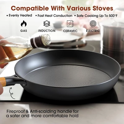 I: Efficient & Even Heat Conduction – The high-quality cast iron pan have the advantages of fast heat conduction and even heating. Its excellent heat retention will keep your food warm for a long time. At the same time, the honeycomb better distributes the oil in the pot evenly in the frying pan nonstick of the honeycomb, cooking with less oil helps to reduce fat intake, better exert the characteristics of the ingredients. and improves the health of life and the quality of food. Make omelets so easy. It also can be a pizza pan, whether you use it to fry pizza or steak, it will offer you the most delicious experience.II: Pro-Safely & Versatile for Various Stove – 2pcs cast iron cooking utensils set is suitably designed for your kitchen appliances such as ceramic, electric, gas, grill and induction, even in the oven. With a practical size of 10 &12 inches, it is incredibly practical for personal or family use. Cook with confidence as the non stick frying pans can safely withstand temperatures up to 500 degrees Fahrenheit. Whether you’re frying, lightly pressure cooking, grilling, etc., these nonstick frying pans set are perfect for all your culinary needs. It’s also portable! When travel with family or friends, or during outdoor picnics, Imarku pans offer excellent portability and are compatible with a variety of stoves, enabling the convenient preparation of delicious meals in outdoor environments.III: Easy To Clean & Dishwasher Safe – The seamless rivet design avoid dirt and grime buildup, Simply rinse with water and mild detergent to quickly remove stains. The non stick frying pan set are dishwasher safe, but hand wash is recommended for maximum longevity. (note: handle should be removed before placing in the dishwasher). IV: Advanced Healthy Nonstick Coating – Engineered with a reinforced nonstick honeycomb surface, our skillet requires minimal oil for perfectly released food. Free of PFAS, PFOA,prioritizing your health without compromising performance. V:Ergonomic Grip & Effortless Cooking – The ergonomically designed and wooden handle is contoured to fit the natural shape of your hand, significantly reducing hand and wrist strain. It provides a secure, non-slip grip even when your hands are wet or greasy, offering superior control and confidence while tossing, stirring, or flipping.The pan is expertly balanced with the weight distributed evenly between the handle and the base. This design prevents the pan from feeling tip-heavy or cumbersome, making it easy to maneuver and lift, which minimizes arm fatigue during longer cooking sessions.he premium non-stick interior ensures food slides out perfectly without sticking or burning. This allows you to cook with minimal oil or butter and makes cleanup remarkably quick and easy, often requiring just a simple wipe with a soft sponge.VI: Reliable – 1 Year Warranty Backed by a 12-month quality guarantee. Our imarku team ensures prompt replacements or refunds for any manufacturing defects. We provide 24*7 customer service ensures quick resolution of any issues, making it an excellent choice for personal use or as a gift for friends.