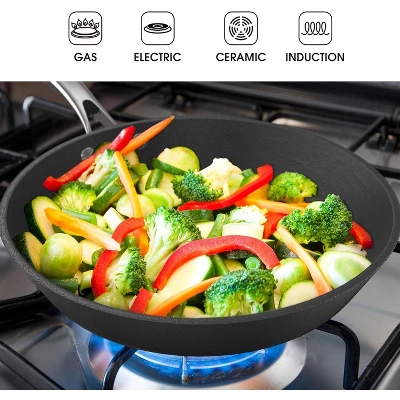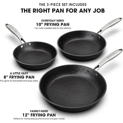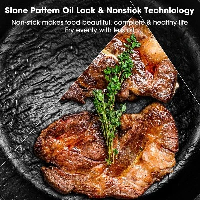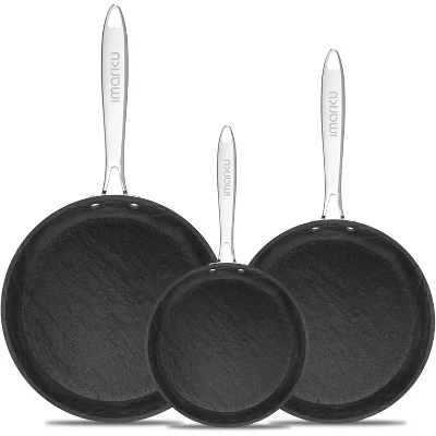 I: Efficient & Even Heat Conduction – The high-quality cast iron pan have the advantages of fast heat conduction and even heating. Its excellent heat retention will keep your food warm for a long time. At the same time, the honeycomb better distributes the oil in the pot evenly in the frying pan nonstick of the honeycomb, cooking with less oil helps to reduce fat intake, better exert the characteristics of the ingredients. and improves the health of life and the quality of food. Make omelets so easy. It also can be a pizza pan, whether you use it to fry pizza or steak, it will offer you the most delicious experience.II: Pro-Safely & Versatile for Various Stove – 3pcs cast iron cooking utensils set is suitably designed for your kitchen appliances such as ceramic, electric, gas, grill and induction, even in the oven. With a practical size of 8, 10 &12 inches, it is incredibly practical for personal or family use. Cook with confidence as the non stick frying pans can safely withstand temperatures up to 500 degrees Fahrenheit. Whether you’re frying, lightly pressure cooking, grilling, etc., these nonstick frying pans set are perfect for all your culinary needs. It’s also portable! When travel with family or friends, or during outdoor picnics, Imarku pans offer excellent portability and are compatible with a variety of stoves, enabling the convenient preparation of delicious meals in outdoor environments.III: Easy To Clean & Dishwasher Safe – The seamless rivet design avoid dirt and grime buildup, Simply rinse with water and mild detergent to quickly remove stains. The non stick frying pan set are dishwasher safe, but hand wash is recommended for maximum longevity. (note: handle should be removed before placing in the dishwasher). IV: Advanced Healthy Nonstick Coating – Engineered with a reinforced nonstick honeycomb surface, our skillet requires minimal oil for perfectly released food. Free of PFAS, PFOA,prioritizing your health without compromising performance. V:Ergonomic Grip & Effortless Cooking – The ergonomically designed and handle is contoured to fit the natural shape of your hand, significantly reducing hand and wrist strain. It provides a secure, non-slip grip even when your hands are wet or greasy, offering superior control and confidence while tossing, stirring, or flipping.The pan is expertly balanced with the weight distributed evenly between the handle and the base. This design prevents the pan from feeling tip-heavy or cumbersome, making it easy to maneuver and lift, which minimizes arm fatigue during longer cooking sessions.he premium non-stick interior ensures food slides out perfectly without sticking or burning. This allows you to cook with minimal oil or butter and makes cleanup remarkably quick and easy, often requiring just a simple wipe with a soft sponge.VI: Reliable – 1 Year Warranty Backed by a 12-month quality guarantee. Our imarku team ensures prompt replacements or refunds for any manufacturing defects. We provide 24*7 customer service ensures quick resolution of any issues, making it an excellent choice for personal use or as a gift for friends.