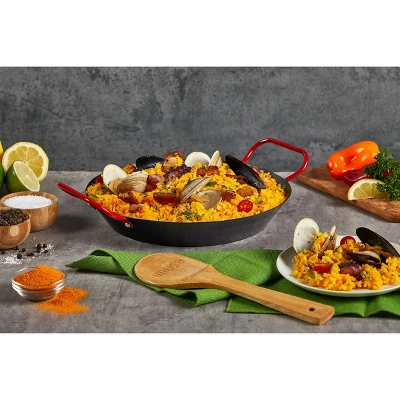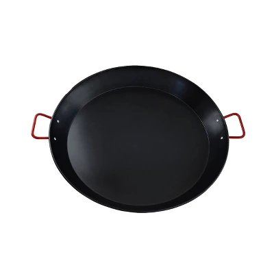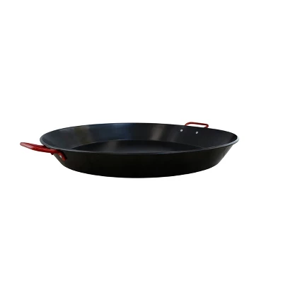 The IMUSA 10” Carbon Steel Paella Pan is perfect for creating exquisite rice meals. Its classic and wide surface design allows you to cook in large amounts. It also features sturdy side metal handles for easy transporting and quick serving. It’s truly the perfect cookware for Latin favorites. The pan heats up quickly and evenly providing perfectly cooked meals each time. The slightly elevated walls are designed to avoid spells when in use. The best part is that the surface is nonstick so you can use a minimum amount of oil when cooking, resulting in healthier cooked meals and also making clean-up a breeze. This paella pan is versatile and durable and can be used on glass, ceramic, and electric stovetops. Feel free to use it as a serving dish after cooking.