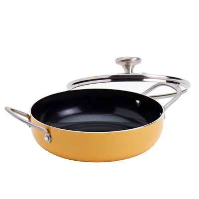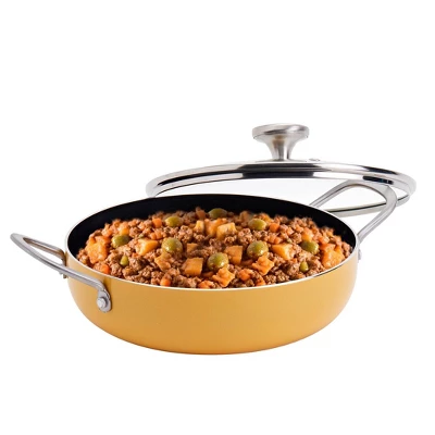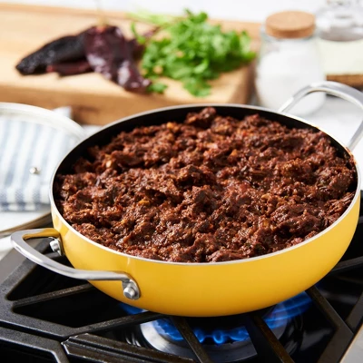 INFUSE brings the intense flavors of Latin cuisine to your kitchen with a cookware collection that celebrates the cultural significance of Latin cooking. Our assortment is designed to honor the rich history of the cuisine and bring out the delightful aromas and delicious flavors that have made the food so popular worldwide. Whether you’re cooking rice, braising meat, or simmering a stew, grab a reliable caldero and enjoy an authentic and deliciously prepared meal. This caldero, from the Spanish ‘cauldron’, features rounded sides that are built to handle a wide variety of recipes, similar to a sauté pan. This beautiful 3-quart yellow caldero is dependable and versatile, made of durable aluminum that heats up quickly and evenly, and finished with a premium non-stick coating for excellent food release and easy cleanup.