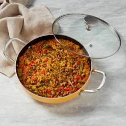 INFUSE brings the intense flavors of Latin cuisine to your kitchen with a cookware collection that celebrates the cultural significance of Latin cooking. Our assortment is designed to honor the rich history of the cuisine and bring out the delightful aromas and delicious flavors that have made the food so popular worldwide. Whether you’re cooking rice, braising meat, or simmering a stew, grab a reliable caldero and enjoy an authentic and deliciously prepared meal. This caldero, from the Spanish ‘cauldron,’ features rounded sides that are built to handle a wide variety of recipes, similar to a saute pan. This beautiful 6-quart yellow caldero is dependable and versatile, made of durable aluminum that heats up quickly and evenly, and finished with a premium non-stick coating for excellent food release and easy cleanup.