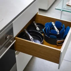 - Nesting design and folding stainless-steel handles save up to 50% more space than a standard 3-piece pan set. Handles 20-year lifetime tested