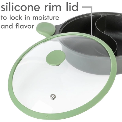 Set up a restaurant-quality hot pot experience at home with the Kenmore Theodore 6.5-quart Cast Aluminum Hot Pot with Divider and Lid. Made from heavy-gauge cast aluminum, this pot distributes heat evenly for optimal culinary results. Cook two side dishes or soup flavors simultaneously in the divided, nonstick interior to recreate your restaurant favorites to family and friends. Wide handles provide a safe grip when lifting from the kitchen to the table. Serve rich broths and delicious meals from any stovetop. This piece of cookware offers the flexibility to use with induction, gas, electric, and other radiant cooktops. It comes with a tempered glass lid to lock in heat and moisture. Complete a Japanese shabu-shabu or a Szechuan hot pot spread with this cast aluminum pot as a beautiful cooking and serving centerpiece. Hand wash recommended.