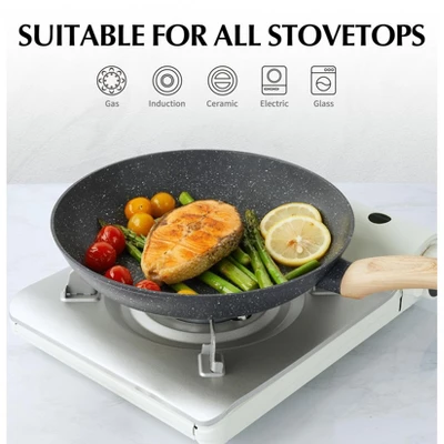 PFOA/PTFE-Free coating ensures healthy cooking, free from harmful chemicals like lead and cadmium.Heat-resistant Bakelite handle stays cool to the touch for safe handling.Magnetic composite base works seamlessly on induction, gas, electric, and ceramic stovetops.Energy-efficient design reduces cooking time while delivering consistent results.