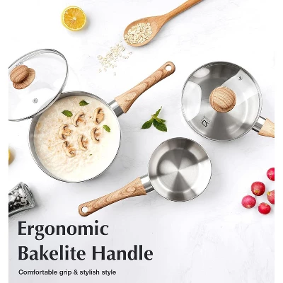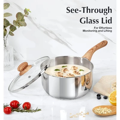 Premium 18/10 stainless steel cookware made for everyday cooking. The polished stainless steel design has a gorgeous finish that will shine in any kitchen. With a stay cool-handle, a shatter-proof lid, and rolled rim for easy pouring, this pan was built for cooks looking for long-lasting cookware.