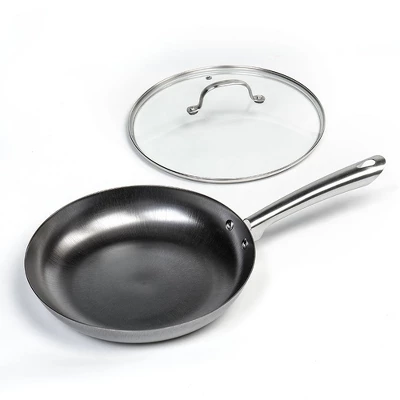 This skillet is infused with nitrogen, creating a harder-than-common-cast-iron finish. It has all the benefits of cast iron but with a surface that can’t be scratched off, will never chip and creates a non-stick surface It may just be the lightest iron skillet you’ll find. Features a cool, smooth stainless steel handle. Comes with a heatproof glass lid so you can watch your food as it cooks – no splattering. Dimensions: Inside 11″ID x 2″D, Outside 11 1/8″OD x 2 1/8″H, Weight with lid 4 3/4 lb (just skillet 3 lb). Helpful Hint: Care and cleaning of cast iron cookware is easy! It may be just a little different from what you are used to, though.Unlike conventional seasoned cast iron cookware, this skillet can be scoured. Its non-stick properties are from nitrogen infused into the iron, not seasoning that only lies on the surface. So, scour to your heart’s content! Hand washing is best. Washing in a dishwasher may cause stains. Stains can be removed by seasoning the pan.Seasoning: Seasoning is not needed, unlike other cast iron cookware. However, the non-stick properties of the pan can be slightly improved if you season it. Detailed instructions for this are included with the pan. You can season it by frying a batch of bacon or coating the pan with cooking oil and heating it in your oven. If you season it, keep in mind that scouring will remove the seasoning. To remove cooked-on food: Pour enough water into the skillet to cover the cooked-on residue. Bring the water to a rolling boil. Carefully pour off the water. Rinse the pan until cool. Wipe clean with a plastic scouring pad. If you seasoned the pan, this will not remove the seasoning. This process sterilizes the pan. You can dry and store the pan without washing it. Black residue left on the pan after cleaning? This is a harmless carbon residue left from cooking or seasoning. If it bothers you, you can remove it by gentle scouring. If you like the pan seasoned, keep in mind that scouring it can remove the seasoning.White residue left on the pan after cleaning? This is harmless calcium deposits from your water. To remove, scour the pan. Then, mix ½ cup vinegar with ½ cup baking soda in a plastic container. Spread the paste on the white stains and let soak. Wash and scour the pan. Repeat if needed. (This treatment will remove seasoning.)