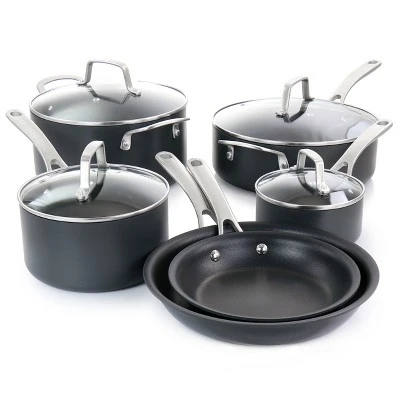 Suit up the kitchen work area with the Martha Stewart 10 Piece Nonstick Hard Aluminum Cookware Set in Matte Black. The nonstick coating allows for more forgiving cooking and provides a fast cleanup. Its aluminum body evenly distributes heat and is oven safe up to 480F. For long lasting quality its recommended to hand wash the cookware. Create the perfect pasta dish, simmer beautiful bechamel sauce, or make a savory steak for dinner tonight.