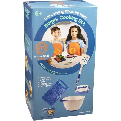 Officially licensed MasterChef Junior Burger SetKids cooking kit comes with a mixing bowl turner cutting board burger press and recipe cardsSet also features 3 unique recipe cards for all levels of experience plus 1 blank recipe card to write your own recipe!Includes real cooking tools with kid-safe non-slip silicone grips / Ages 6 and up / Food not includedMakes a great gift for little chefs in training! / Collect all sets and become the ultimate MasterChef Junior!