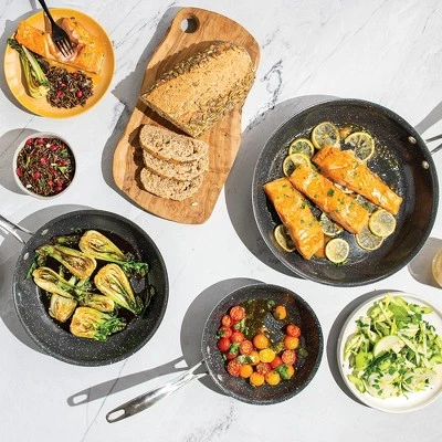 The skillet trio to meet all your needs! The Basalt 3-piece set includes a 8″, 10″, and 12″ skillet, crafted with a next-generation ceramic non-stick coating ensuring quick and efficient cooking. Engineered from natural aluminum to guarantee rapid and even heating, ensuring perfectly cooked vegetables, meats, and other ingredients every single time. With a comfortable cast stainless riveted handle that stays cool on the stovetop, you’ll have complete control and maneuverability while cooking. In addition to their stovetop versatility, these Skillets are also oven-safe, giving you the flexibility to finish cooking meals in the oven or keeping food warm as you finish cooking on the stove. Upgrade to professional-grade ceramic-coated cookware and experience unparalleled quality and performance using the Basalt cookware line, proudly made in the USA..