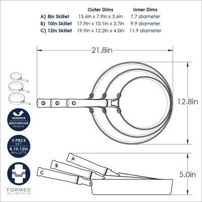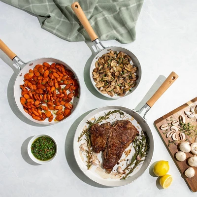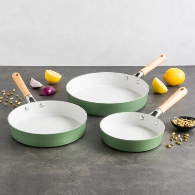 From morning eggs to family dinners, the Cardamom™ Ceramic Nonstick 3 Piece Fry Pan Set offers the perfect trio for every meal. Sized just right with 8,10, and 12 inch skillets, this set covers everything from quick bites to hearty meals. Crafted from spun aluminum for fast, even heating and finished with a double-layer ceramic nonstick interior, each pan combines everyday performance with elevated Scandinavian-inspired style. Natural wood handles add warmth and grip, while the non-toxic ceramic coating ensures a healthier cooking experience. Compatible with gas, electric, and ceramic stovetops, this thoughtfully designed set is as beautiful as it is versatile. Set includes: 8 inch Ceramic Nonstick Frying Pan, 10 inch Ceramic Nonstick Frying Pan and 12 inch Ceramic Nonstick Frying Pan.