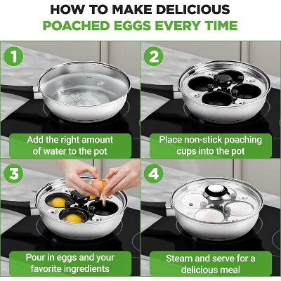 - 4 Non-Stick Poaching Cups: Ensures easy release of eggs without sticking.