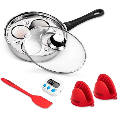 Create perfect poached eggs with the NutriChef Egg Poacher. Made of durable stainless steel, this egg poacher features 4 non-stick cups, a transparent glass lid, and a digital electronic timer to ensure perfect results every time. Ideal for preparing eggs for breakfast or brunch or making Eggs Benedict.