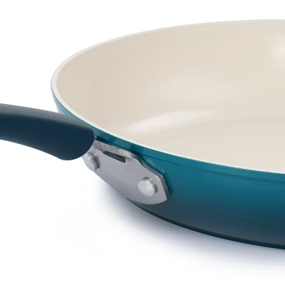 Put together fantastical dishes with the Oster Corbett 12 Inch Nonstick Aluminum Frying Pan in Blue. Featuring a safe nonstick ceramic surface, the pan allows for healthier meals be reducing the amount of need oils and fats. A soft grip handle stays cool to the touch for safe and secure handling. Efficiently and evenly cook food with the aluminum body for proper meals. Surprise guests with seared salmon, a perfect plate of penne pasta or enjoy some eggs and bacon in the morning!