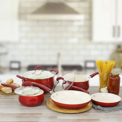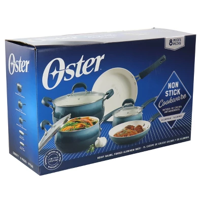 Liven up the kitchen space with the Oster Corbett 8 Piece Nonstick Aluminum Cookware Set in Blue. This charming belly shaped cooking set allows for well distributed heating while providing a large carrying capacity. Soft grip handles stay cool to the touch as they give you a comfortable hold. Cut down on oils and fats, thanks to the ceramic nonstick interior. For long lasting care, hand wash the cookware and avoid using abrasive tools. Create soups, curries, stews or any other warm comforts for the family to enjoy.