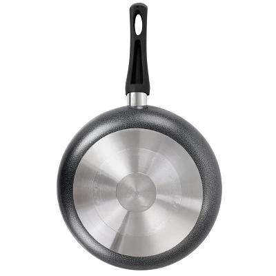 The Oster Pallermo 11in Nonstick Aluminum Frying Pan is designed to last with it’s legendary performance. Features a nonstick interior coating for easy food release and clean up and a Bakelite handle that stays cool while in use. Made of sturdy but lightweight aluminum material with a speckled interior and 2.25in raised sides. Compatible with gas, electric, and vitroceramic stove tops. Includes: One 11in Frying Pan.