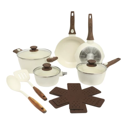 - * TEMPERED GLASS LIDS: The pots come with vented glass lids that provide visibility to monitor the food while cooking. PROTECTIVE FELT PADS: Washable pan protectors help prevent surface damage and scratches. HEAT-RESISTANT COOKING UTENSILS: Two silicone cooking tools are gentle on nonstick interior, ceramic nonstick coating, enameled finish and other delicate surfaces.