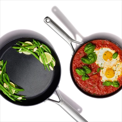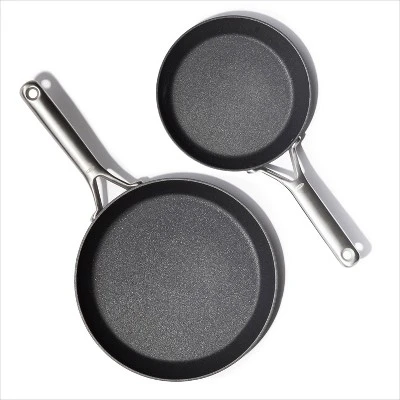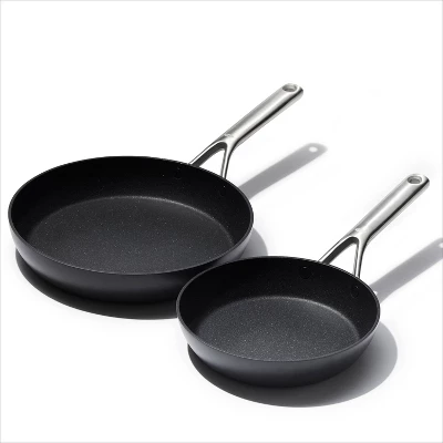 Get more room and better performance with the OXO Ceramic Professional Non-Stick 2-Piece Frypan Set. Each of these pans features a diamond-reinforced ceramic non-stick coating that delivers effortless food release with less oil. Cleanup is easy, plus our ceramic non-stick coating is free of PFAS, PFOA, lead and cadmium. This collection’s scratch-resistant, hard-anodized aluminum bodies heat faster and more evenly than traditional aluminum, and the thoughtfully designed shape means up to 35% more room to cook in each pan. Optimized for any kitchen, this set has heavy-duty induction bases that works on every stovetop and they’re dishwasher safe.