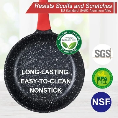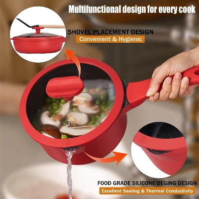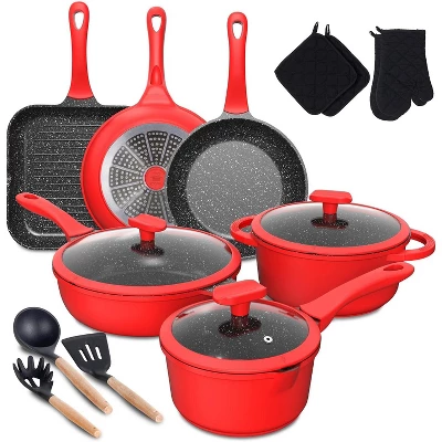 ¡¾Nonstick Coating Without Warping & Flaking¡¿ Scratch-proof non-stick granite coating keeps food sliding smoothly along the surface, preventing food to stick, and making cooking easier. Sturdy interiors can avoid chipping and coming off. imarku pots and pans set are made of high-temperature die-casting, making the cooking pots with a thicker body, and reinforced with a wobble-free base for extra strength and heating. ¡¾Health Cooking¡¿ imarku kitchen cookware sets adopt EU standard aluminum alloy(EN601), which can be in direct contact with food, including trace elements such as titanium, zinc, strontium, magnesium which are beneficial to the human body. Toxin-free Whitford xylan surface layer ensures this pots and pans are free of PFOA, PFOS, lead & cadmium. (Have FDA certification for SGS testing) ¡¾Ultra-Durable & Heat-Resistant Handles¡¿The handle of the pan set is covered with soft rubber to keep staying cool and allow total control with a comfortable grip. Vented tempered glass lids trap in heat and moisture. Food-grade silicone edging of the cookware for better sealing. Suitable for ceramic, electric, gas, grill, and induction cooking stoves, quick and even heating. Safe cooking temperature up to 480¡ãF. ¡¾Easy to Clean¡¿Coated nonstick coating three times to deliver food release easily, rivetless interior to prevent snags and food buildup, this pot and pan set is easy to help you solve sticky or difficult-to-clean problems. Hand-wash with the cotton sponge or dishcloth after the cookware cools down to prevent the surface from being scratched. (Do not use sharp shovels or brushes) ¡¾16-Pic Red Cooking Sets¡¿imarku pots and pans set nonstick include 2-quart milk pot, 5.5-quart stockpot with glass lid, 9.5″ &11″ frying pan, 11″ * 3.15″ H frying pan with glass lid, 11″ square frying pan, 3 different silicone spatulas, soft heat insulation pads and gloves (to make your complicated kitchen work safer). A perfect gift for Mother’s Day, Weddings, Valentines, Housewarming, Thanksgiving and Christmas.