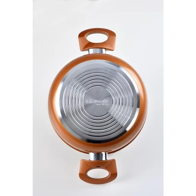 The Ravelli Italia Linea 20 Non Stick Dutch Oven is a high-quality, versatile kitchen tool that makes it easy to prepare a variety of dishes. Made of durable 99.5% pure aluminum with 5 PFOA free DYLON non-stick layers, this Dutch oven is built to last. It features a copper-toned finish and a glass lid with ventilation for temperature regulation. The ergonomic heat resistant soft-touch Bakelite panhandles provide a comfortable grip, and the Spitfire grooved bottoms ensure even heat distribution for energy saving. The Ravelli Italia Linea 20 Non Stick Dutch Oven is dishwasher safe for easy cleanup.