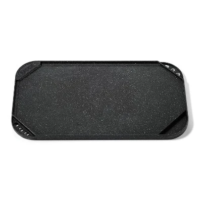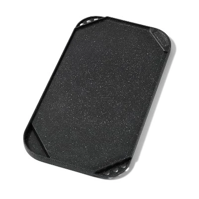 THE ROCK by Starfrit 10-6/10 In. x 19-1/2 In. Reversible Grill Griddle can be used on the grill, on the stovetop, or in the oven. The unique Rock.Tec manufacturing process uses small metal pellet impact technology to modify the surface to form an ultra durable rock-like finish. The result is an outstanding release performance, 3 times better than traditional nonstick cookware.