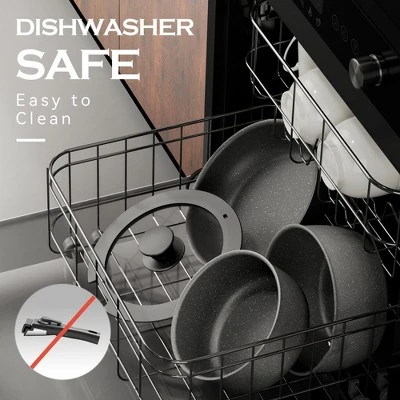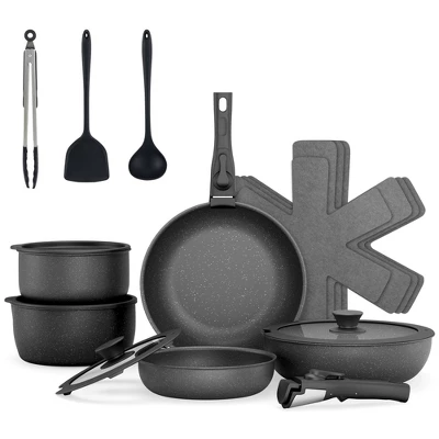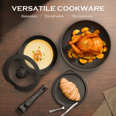 Upgrade your kitchen with this 18-piece granite nonstick cookware set, designed for maximum versatility and space efficiency. Featuring a detachable handle and stackable design, this set seamlessly transitions from stovetop to oven (up to 480°F), fridge, or dishwasher. The advanced nonstick granite coating ensures effortless food release and easy cleanup, while the PFOA-, lead-, and cadmium-free materials keep your meals safe and healthy. Compatible with all stovetops, including induction, this set is perfect for everyday cooking, baking, serving, and storing.